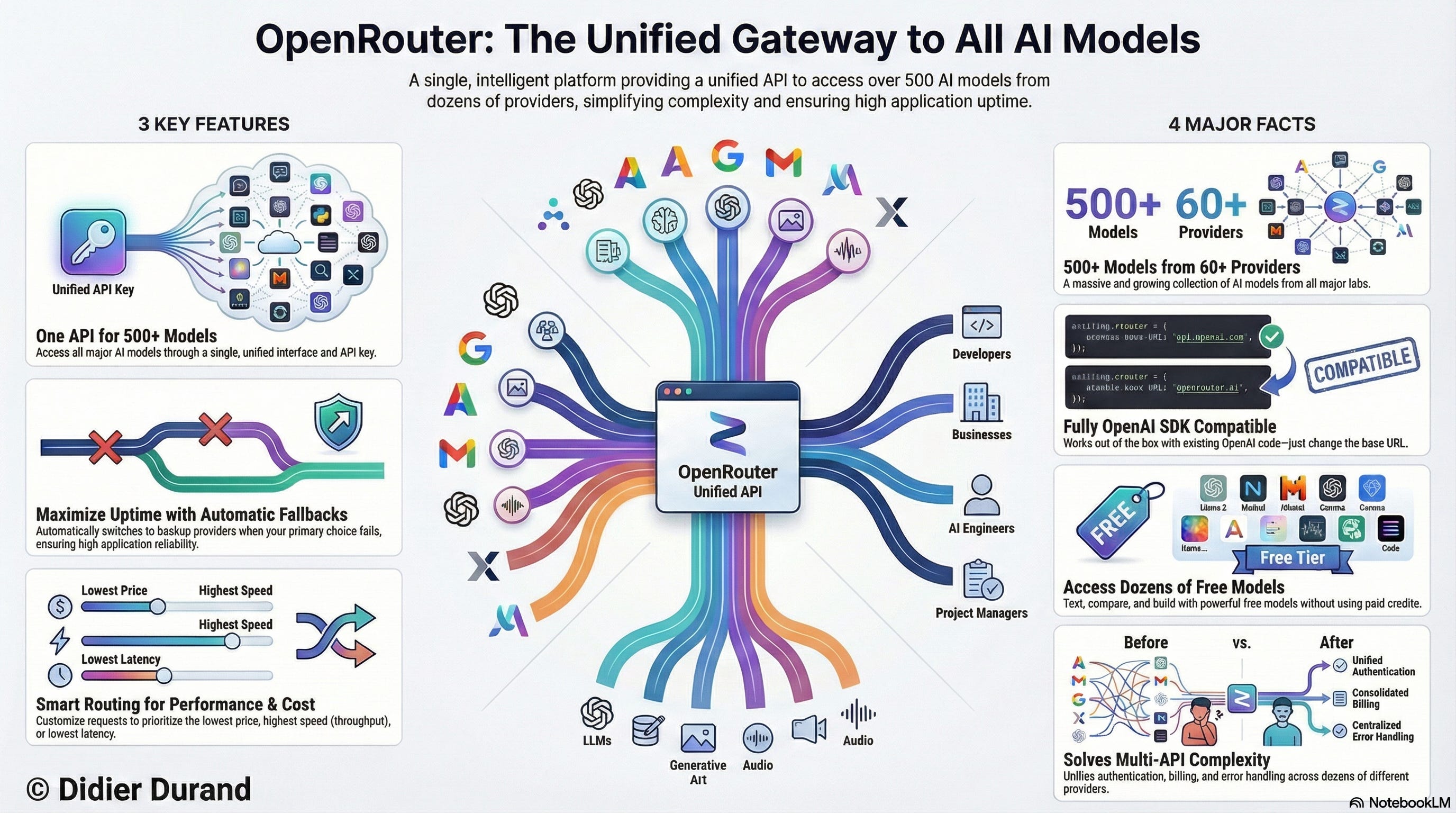 Managing multiple Large Language Model (LLM) provider APIs is a common source of friction for developers. Each platform comes with its own authentication methods, complex pricing models, and unique API specifications, forcing them to build brittle, provider-locked applications that are vulnerable to single-point-of-failure outages and prevent rapid innovation. OpenRouter solves this by offering a unified interface to the entire ecosystem of AI models.